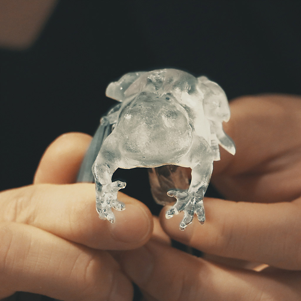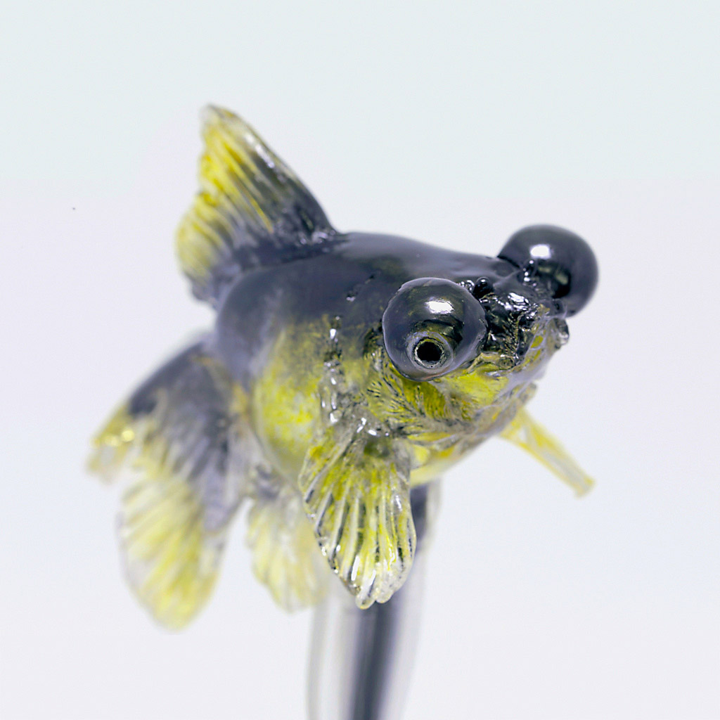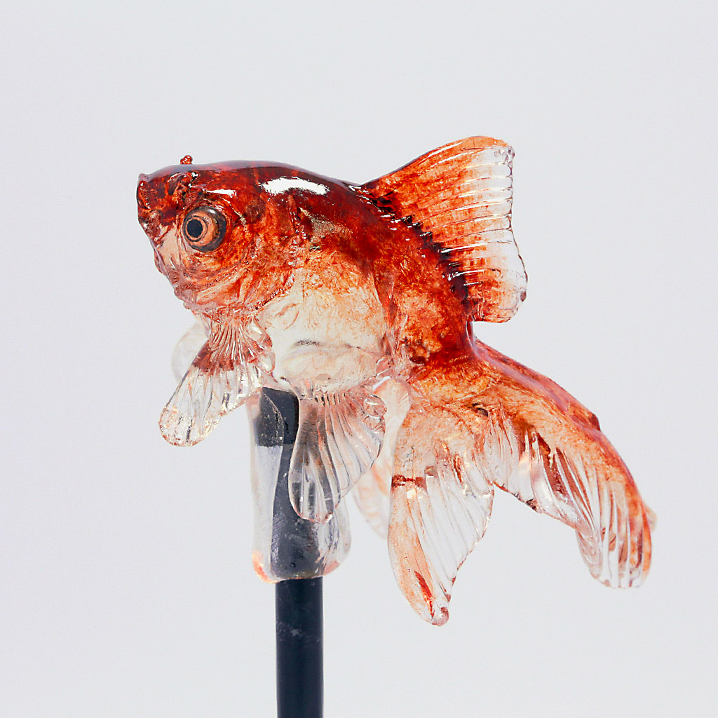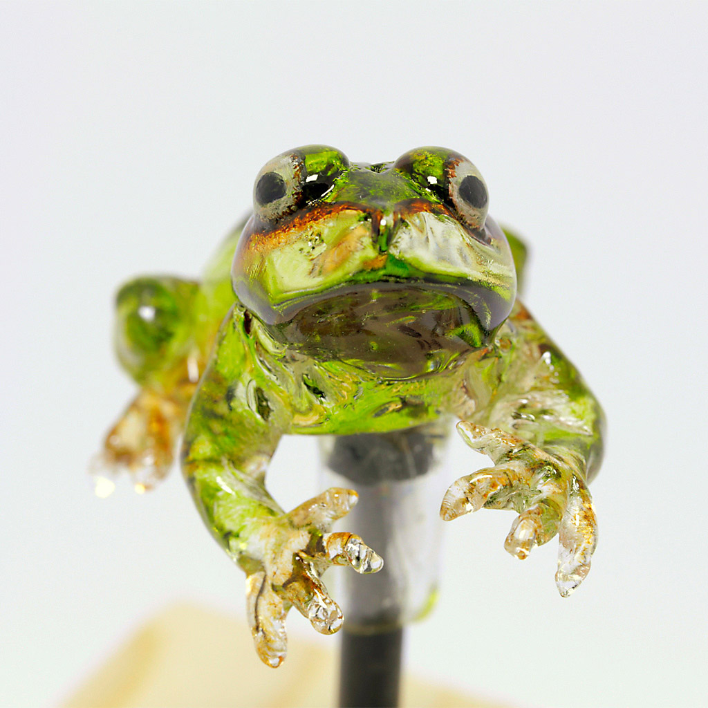 今にも動き出しそうな、いきいきとした金魚やかえるたち。これが飴でできているとは驚きです。アメシン代表の手塚さんが飴細工師を目指したのは20歳のときのこと。飴細工は元々庶民の間で広まったもので、今でいうストリートカルチャー。文献が少なく、飴細工の世界も縮小して弟子入りできる職人が減っていたため、手塚さんは独学で研究を始め、ひたすら飴に向き合う日々が続きました。伝統的な製法では、飴に空気を含ませ、白色にするのが主流。しかし手塚さんは飴を触っているうちに、飴本来の透明感や清涼感を生かせないかと考えるようになりました。そして生まれたのが、透明な飴にあざやかな色を施した作品の数々です。繊細で躍動感のある作品は人々を魅了し、金魚やかえるは、季節を問わない人気商品となりました。