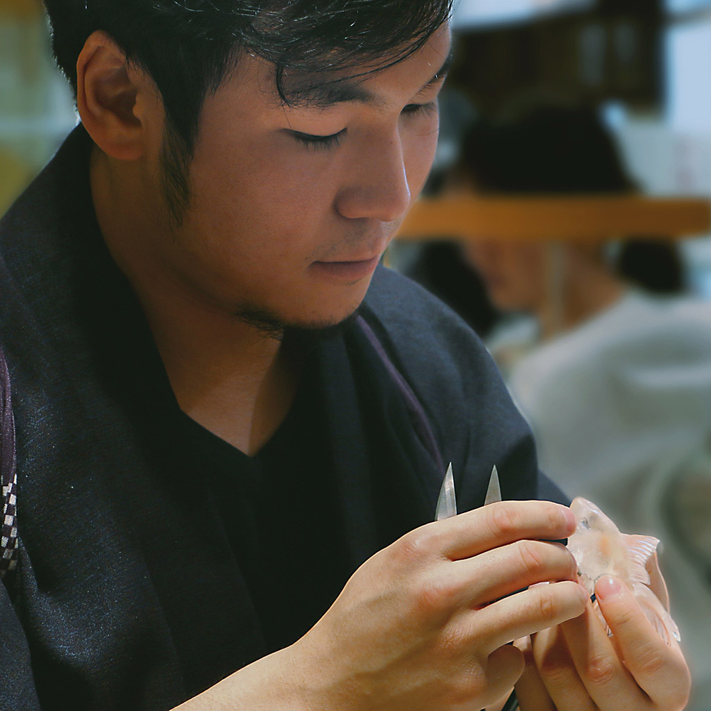 Born in Chiba Prefecture in 1989. Worked with sculpture and carving from a young age. Has since established himself as Japan’s premier amezaiku artist through his brand and amezaiku artist collective Amezaiku Ameshin, holding live candy sculpture demonstrations and workshops throughout Japan, and specializing in made-to-order confections.