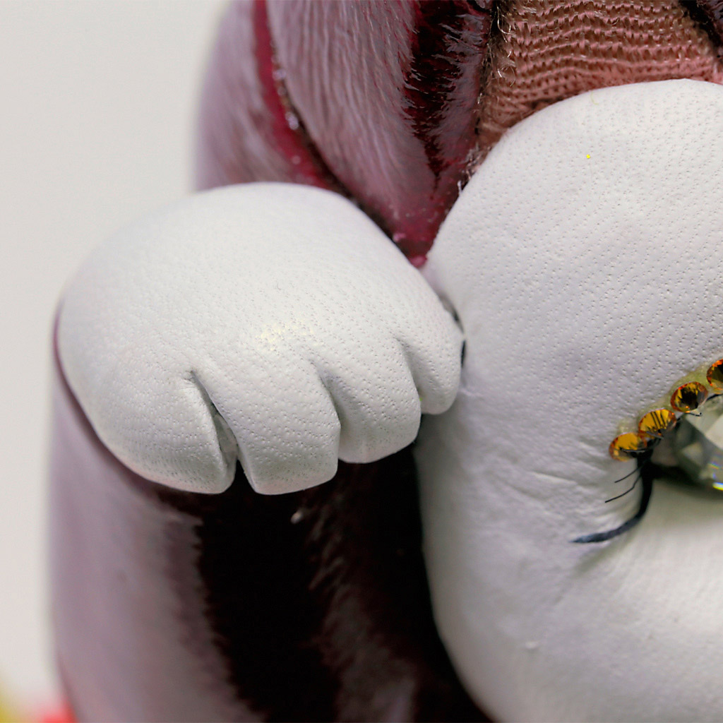 経済産業大臣指定伝統的工芸品に指定されている江戸木目込人形。江戸木目込人形師・柿沼東光氏を父にもつ柿沼利光さんは、お兄さんとともに、柿沼人形を支えています。木目込み作業に従事する傍ら、力を入れているのが新商品の開発です。中でも、今、多方面から注目を浴びているのが、愛らしい招き猫。「木目込人形の特徴であるぽってりとした形が猫にマッチしました。普段、節句人形などに使う西陣織や絹だけでなく、レザーやエナメル素材も取り入れています」と柿沼さん。大きな瞳に天然石を使うなどパワーを宿した縁起物は、ラッキーキャットとして人気を博し、ヨーロッパにも進出。ドイツの見本市では、トレンドセレクションに選出されました。